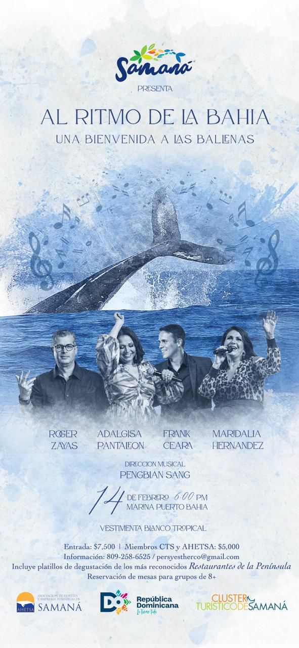 Samaná.- El Clúster Turístico de Samaná (CTS), la Asociación de Hoteles y Empresas Turísticas de Samaná (AHETSA) anunciaron el concierto de bienvenida a las ballenas jorobadas denominado “Al Ritmo de la Bahía”, el próximo 14 de febrero en la Marina de Puerto Bahía Samaná a las 6:00 P.M, con la participación estelar de Maridalia Hernández, Adalgisa Pantaleón, Roger Zayas y Frank Ceara, bajo la dirección musical del maestro Pengbian Sang, con una magnífica orquesta integrada por virtuosos músicos y un coro de primera.